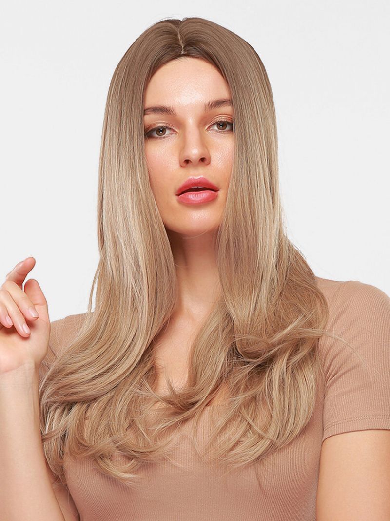 26 Tommer Lysebrun Langt Rett Hår Fluffy Midtre Del Lang Bangs Helhodedeksel Parykker