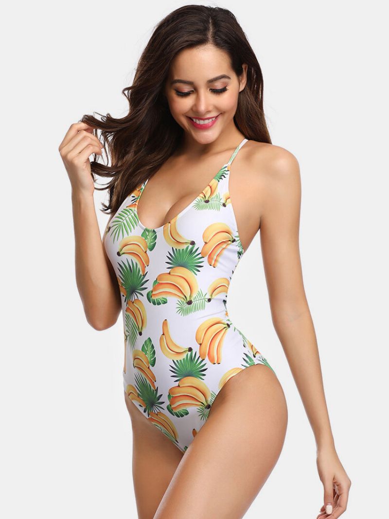 Dame Banantrykk Badetøy Tropisk Sexy Spaghetti Stropper Kryss-cross Ryggløs One Piece