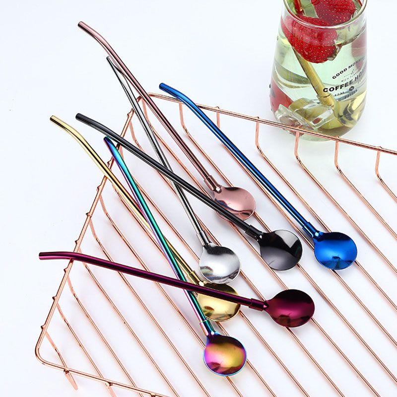 Fargerike Gjenbrukbare 2 I 1 Sugerør Skje Rustfritt Stål Metallsugerrør Cocktailmelk Kaffe