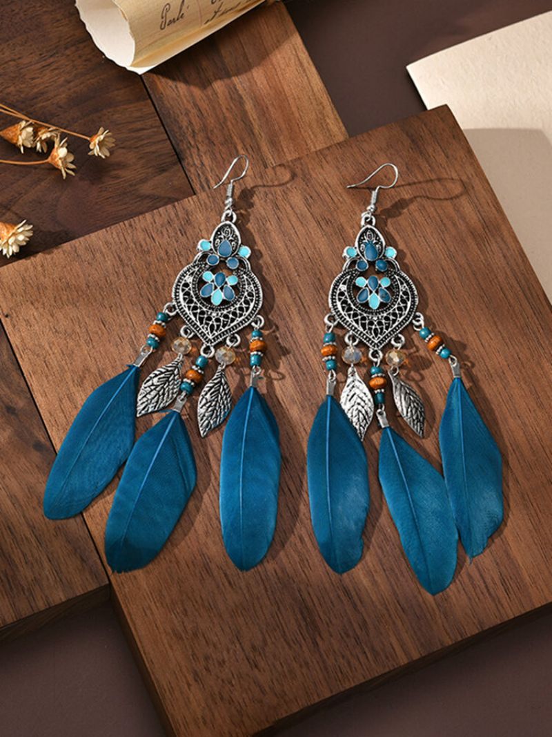 Legering Vintage Etnisk Farge Dyppe Olje Hjerteformede Lange Fjær Øredobber