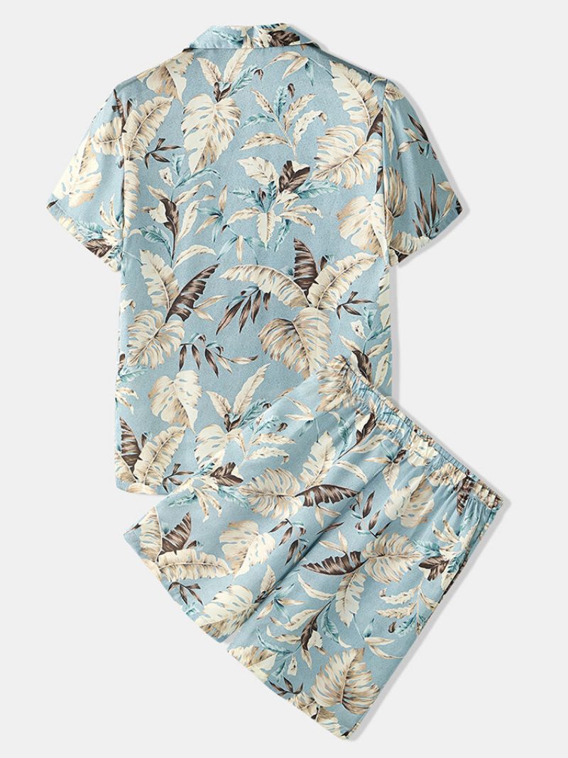 Menn Tropical Leaves Print Loungewear To Deler Imitert Silke Pyjamas Lapeal Krage Tynt Nattøy