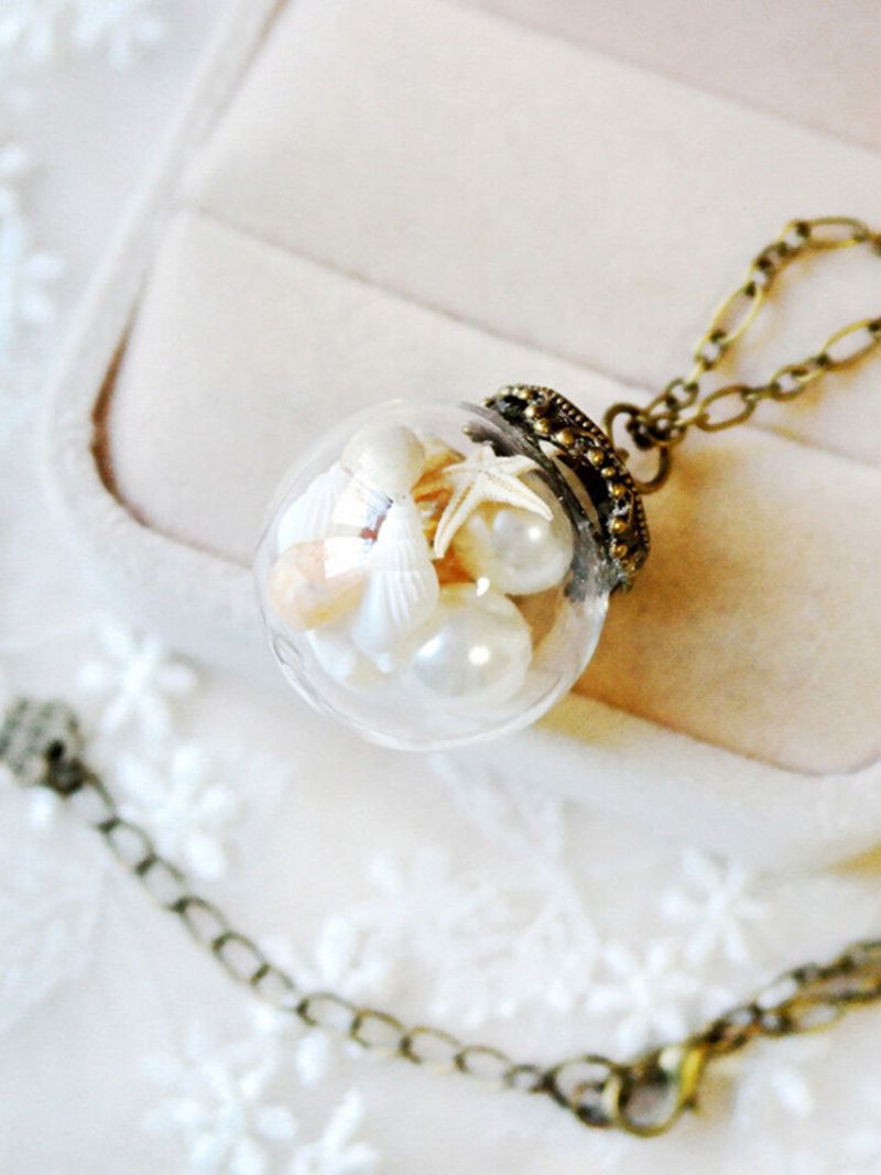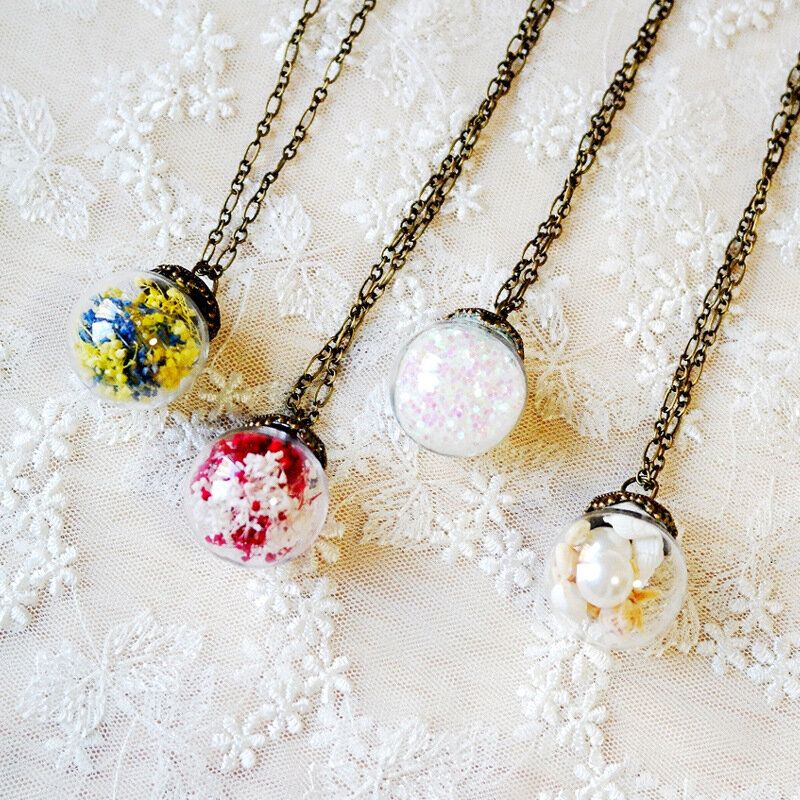 Rund Glass Ball Tørket Blomst Anheng Halskjede Shell Pearl Kvinner Genser Kjede