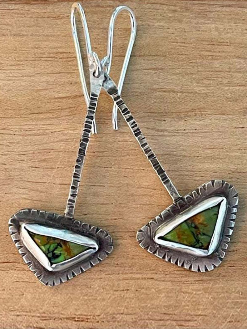 Vintage Distressed Utskåret Kant Trekantet Innlagt Turkis Lange Legering Øredobber