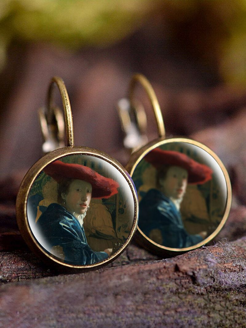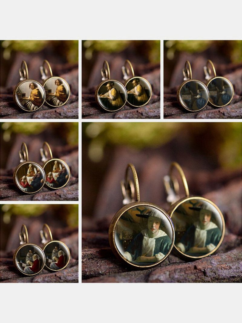Vintage Glass Gemstone Dingle Øredobber Berømte Oljeutskrift Kvinner Anheng
