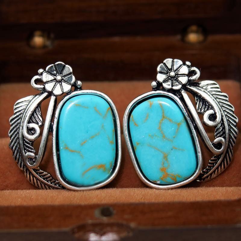 Vintage Turkis Blad Kvinner Øredobber 925 Sølvbelagte Fjær Blomst Anheng